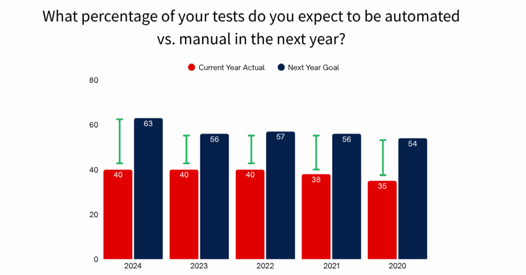 Over the next five years, teams anticipate AI-driven capabilities such as self-healing tests, automated test case generation, and predictive defect detection. These advances could significantly reduce maintenance overhead (45%) and improve test coverage (26%).